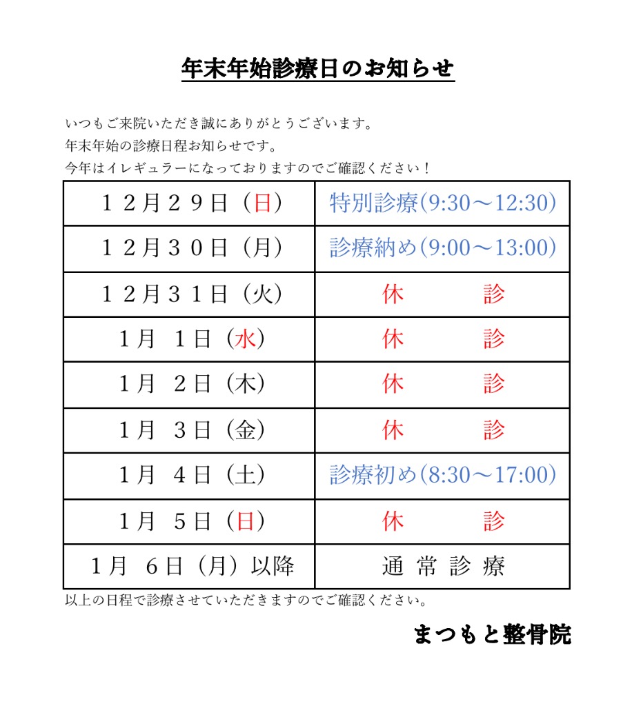 さて今年の年末年始はまつもと整骨院は以下のような日程で行います!