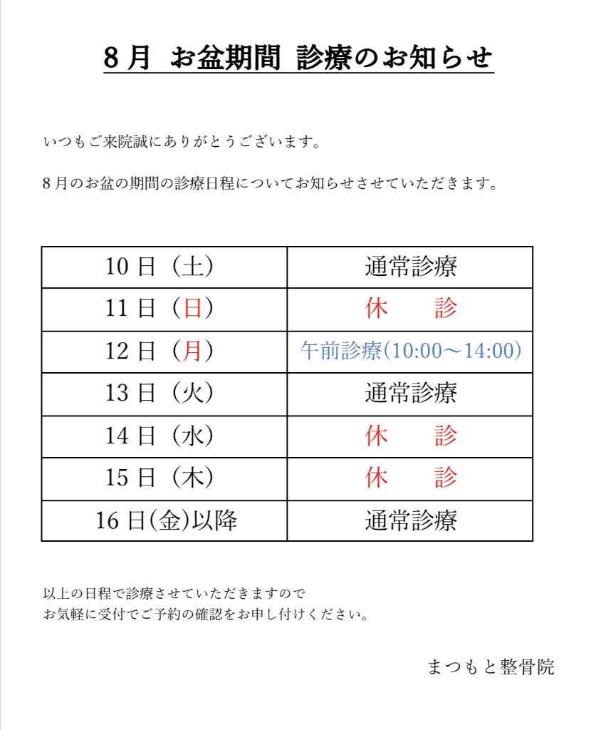 8月お盆期間の診療日程